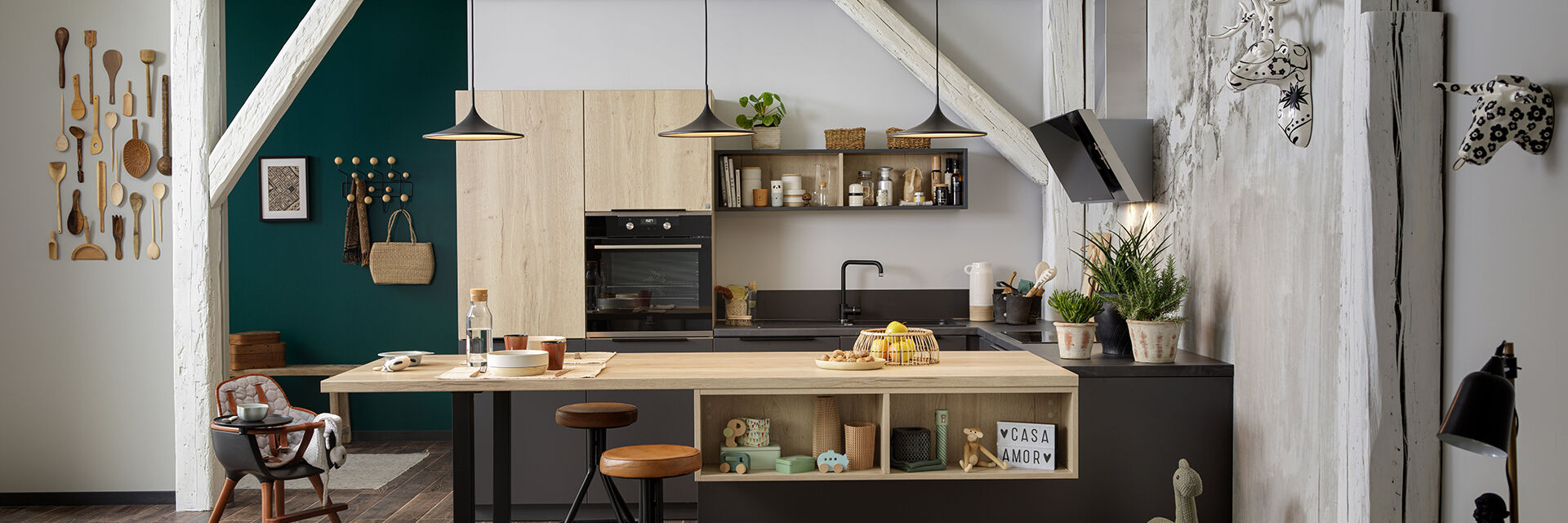Er is niet veel nodig om het sfeervol te maken. Zorgvuldig gekozen details of gewoon alleen maar een goede keukenindeling. Vrij baan voor puur genot; de keuken wordt een schouwtoneel waar het ontspanningsgedeelte naadloos op aansluit. Een lekker glas wijn met kaas en een stokbroodje. Alleen, met z‘n tweeën of als er bezoek komt