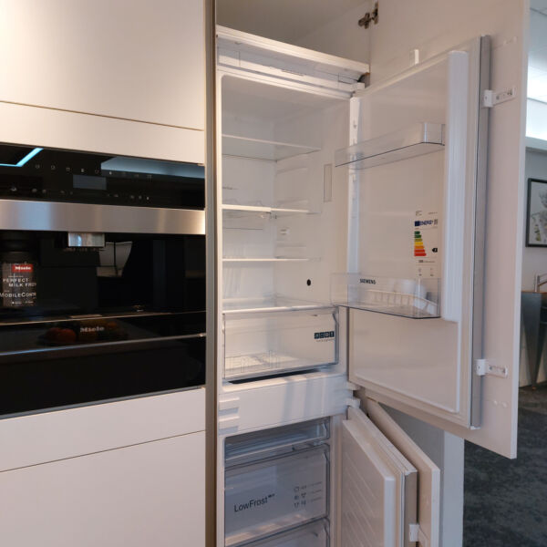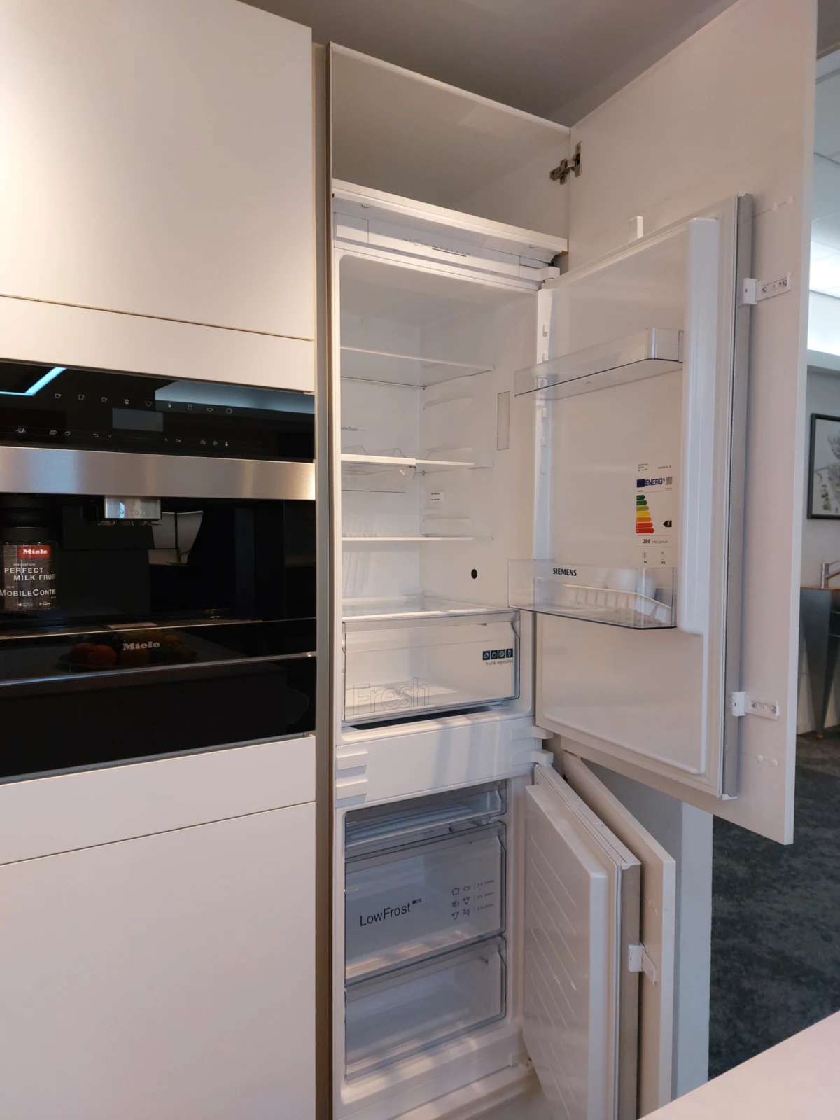 SieMatic showroomkeuken in de uitvoering S2K CD 62001, een keuken met kunststof fronten in de kleur Lotuswit mat. De keuken is greeploos en heeft een edelstaal komgreep. Er zijn vier hoge apparatenkasten toegepast die voorzien zijn van een luxe Miele oven, warmhoudlade en inbouwkoffieautomaat en een Siemens koel/vriescombinatie.