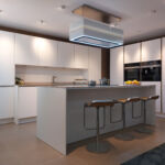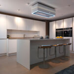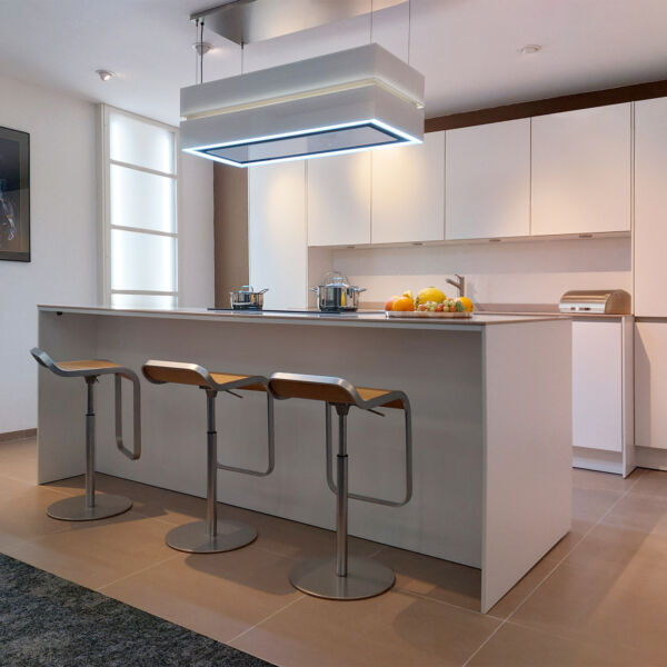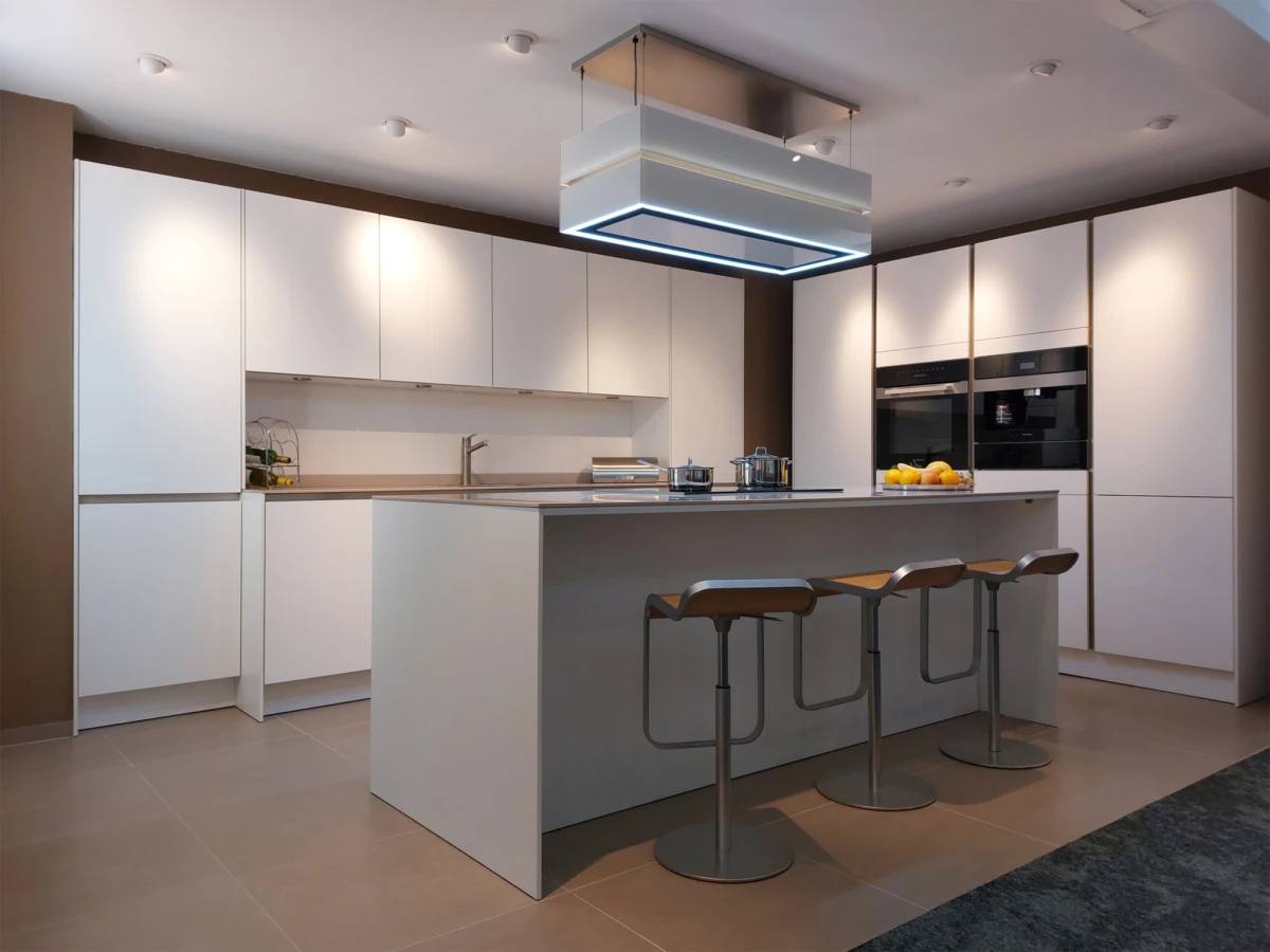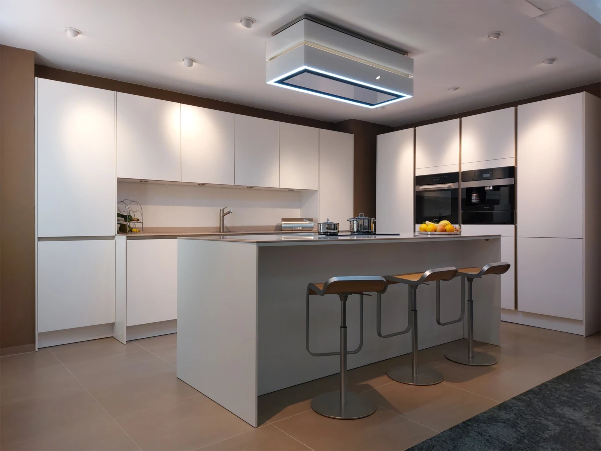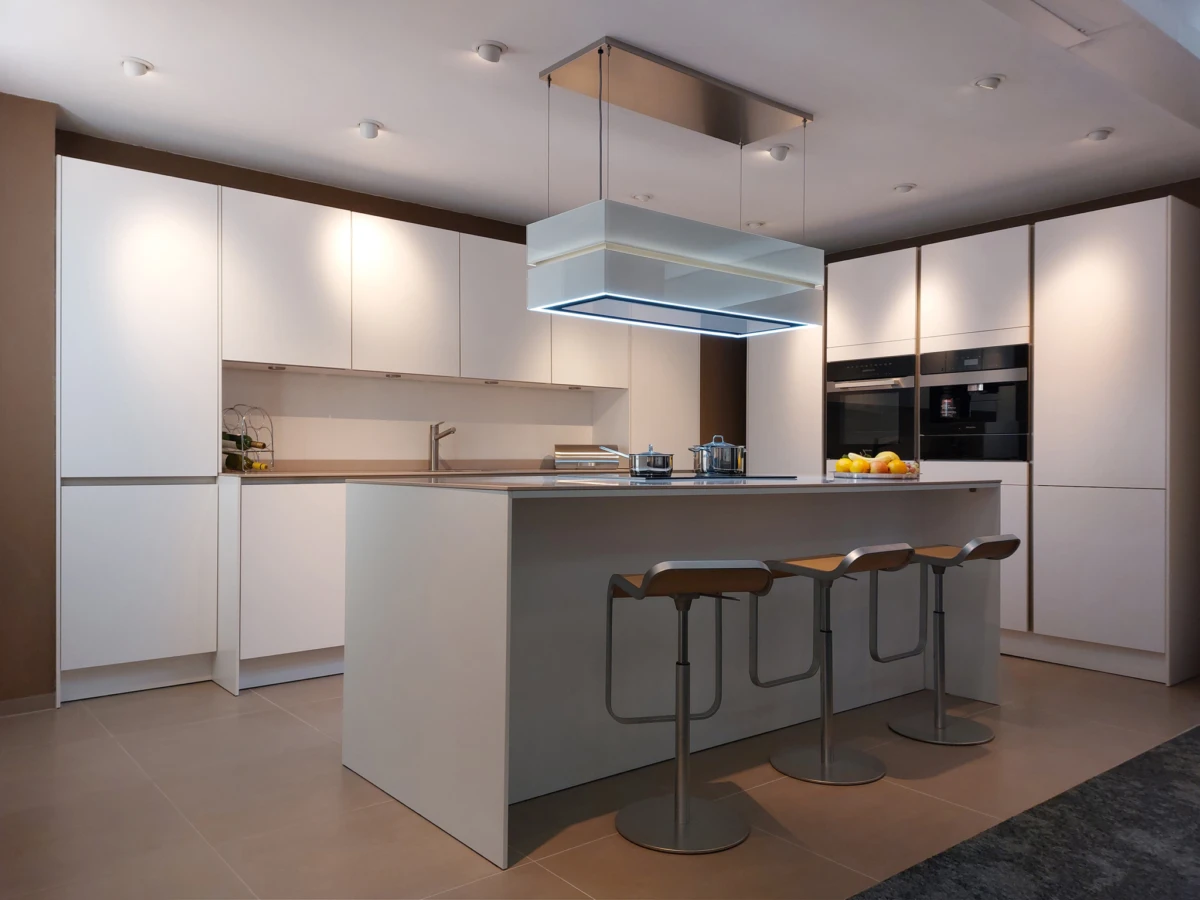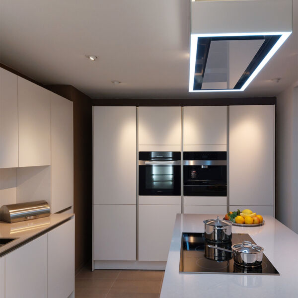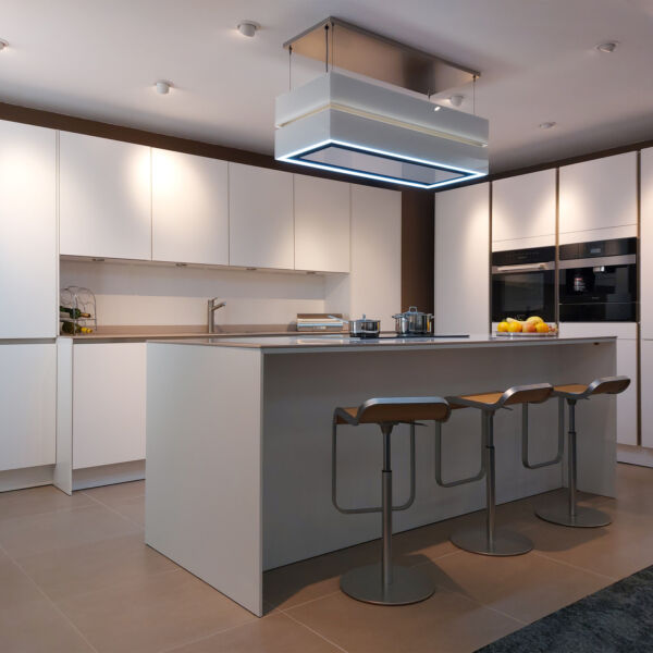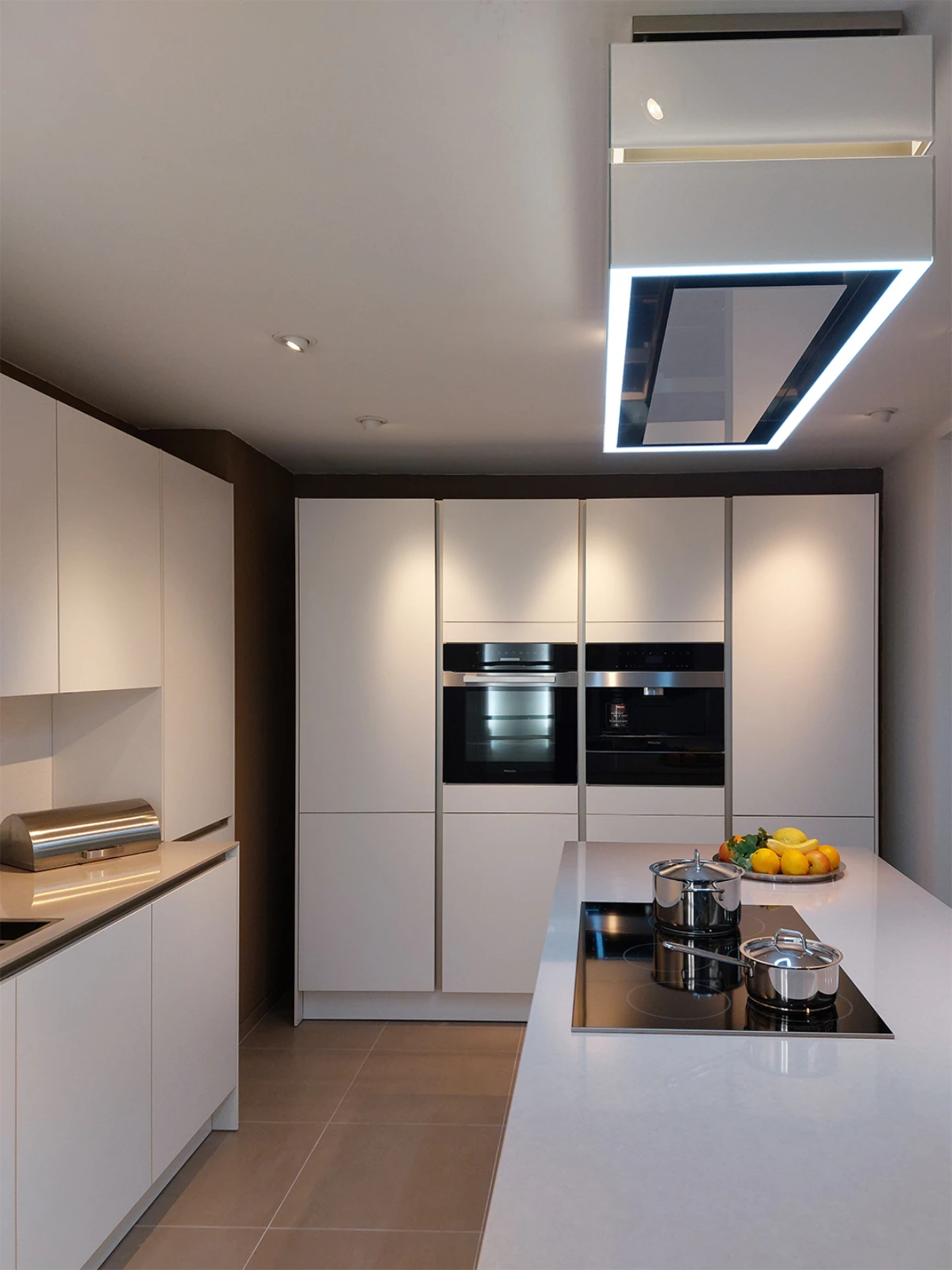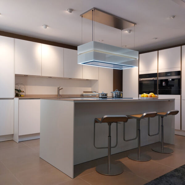 In het royale kookeiland zit een 5-pits inductiekookplaat. Daarboven hangt een Berbel Skyline Edge afzuigkap met liftfunctie. Deze afzuigkap is in hoogte instelbaar, hierdoor is de afzuigkap zeer efficient is tijdens het koken. Na het koken kan de afzuigkap omhoog, zodat deze niet het zicht belemmerd.