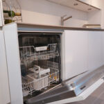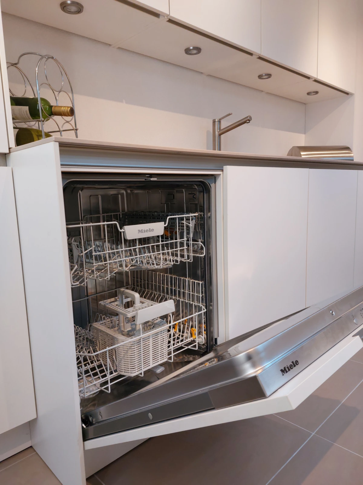 Het spoelgedeelte is voorzien van een RVS spoelbak, mengkraan en Miele vaatwasser. Er is een ombouw gemaakt van ondiepe kasten, wat zorgt voor extra veel opbergruimte.
